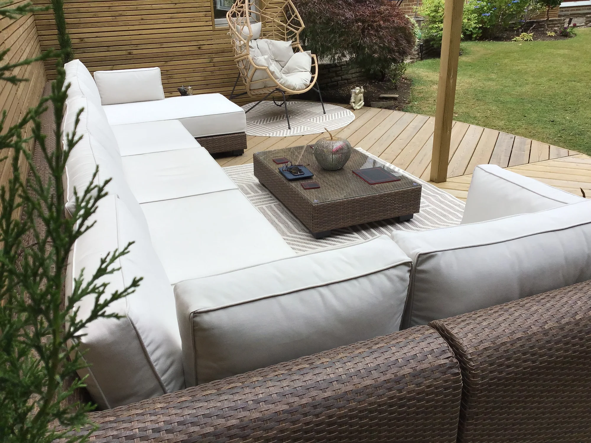 A rattan corner sofa set with cushions in a large garden space